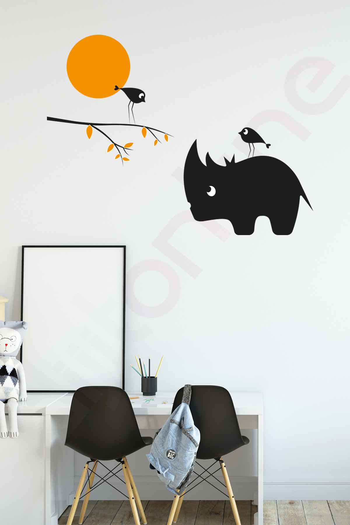 Çocuk Odası Duvar Sticker – Gergedan ve Kuş – 120×91 Cm