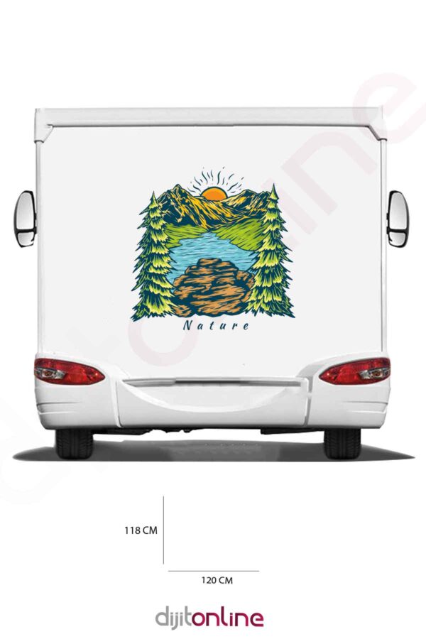 Karavan Doğa Baskı Sticker – Ağaç Sticker – Dağ ve Güneş Sticker – Göl Sticker – 120×118 Cm