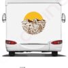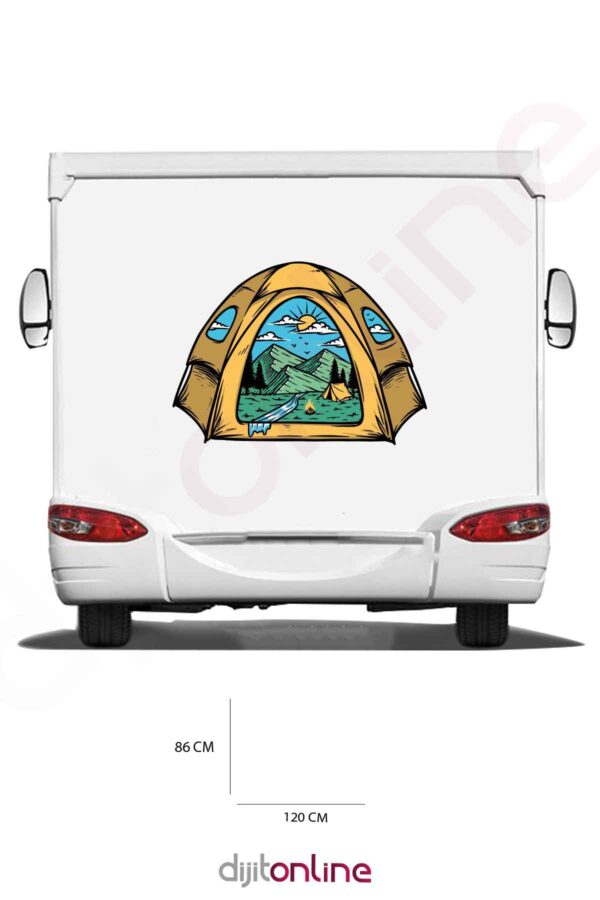 Karavan Kamp Baskı Sticker – Çadır Sticker – Dağ ve Güneş Sticker – Kamp Ateşi Sticker – 120×86 Cm