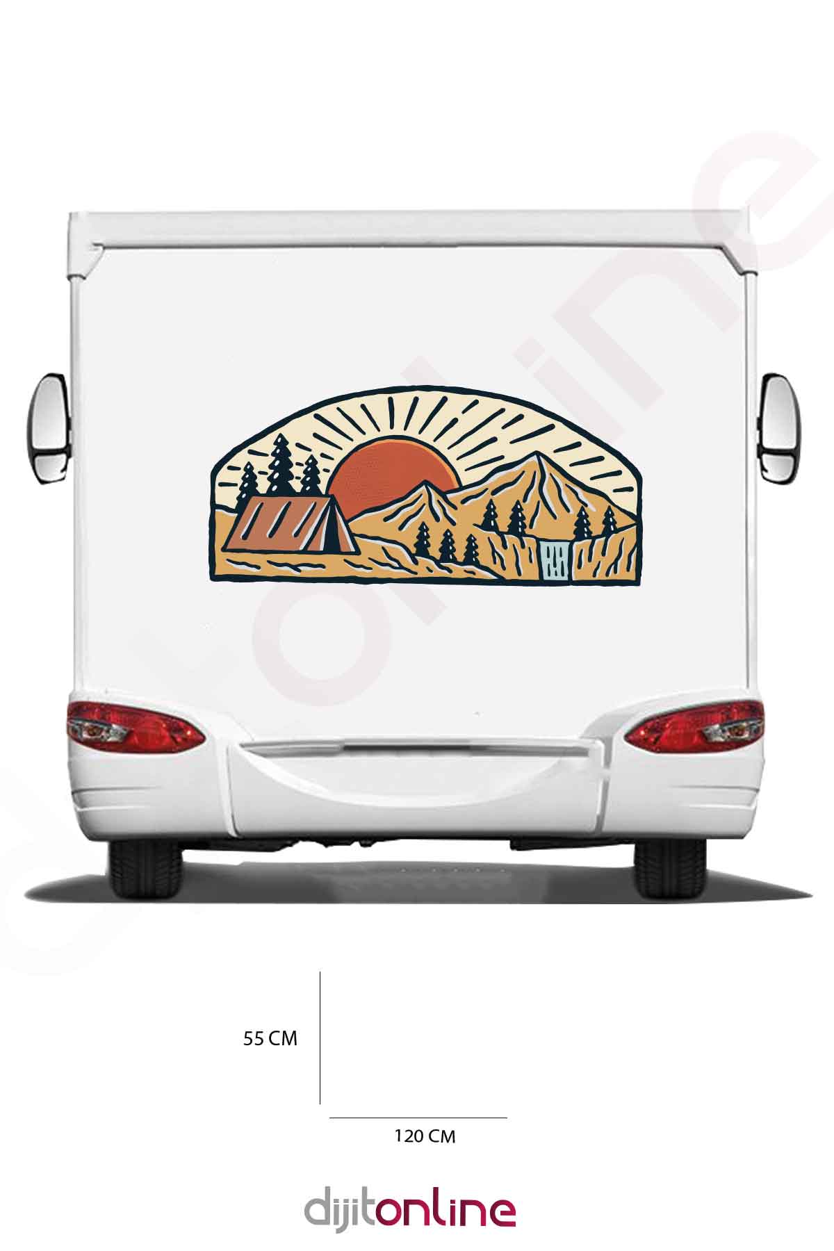 Karavan Kamp Baskı Sticker – Güneş ve Dağ Sticker – Kamp Çadırı Sticker – Ağaç Sticker – 120×55 Cm