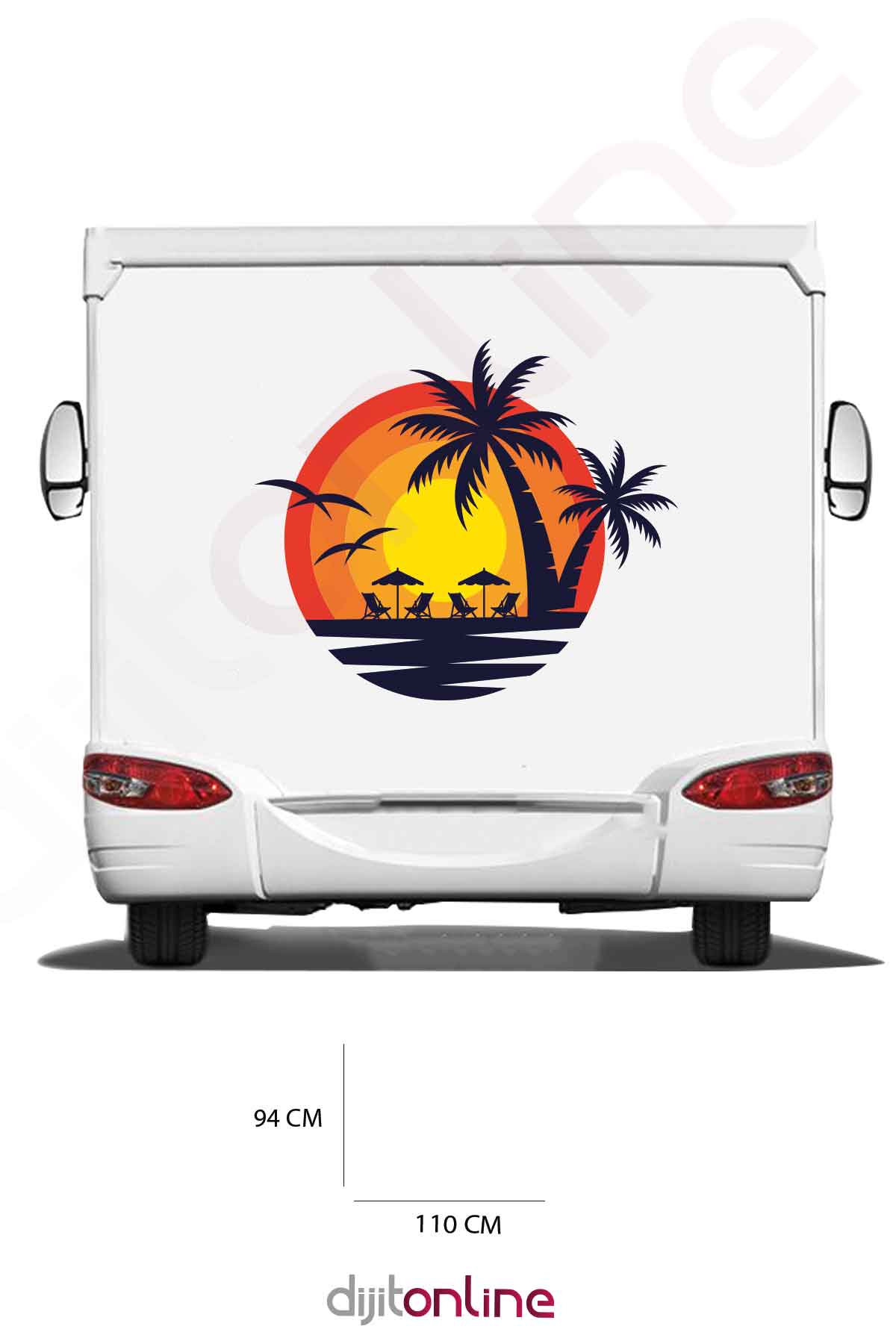 Karavan Palmiye Baskı Sticker – Kuş Sticker – Güneş ve Şezlong Sticker – 110×94 Cm